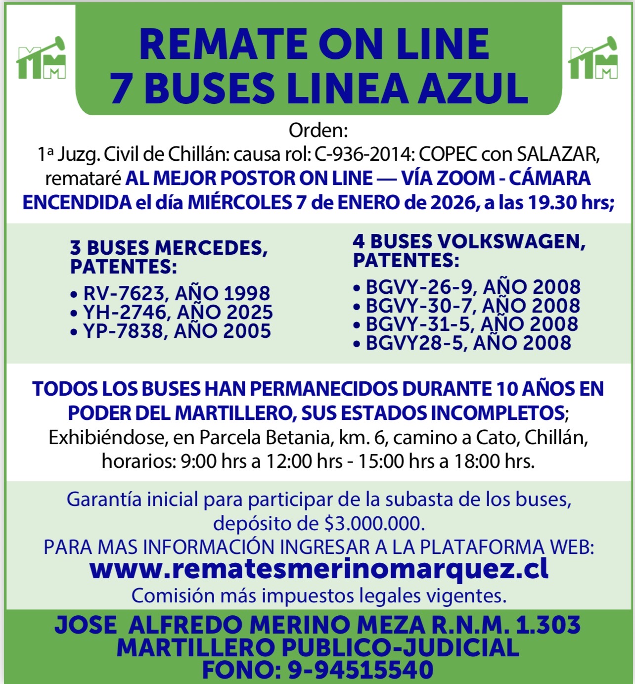 Exhibiéndose de 9:00 a 12:00 – 15:00 a 18:00 hrs en Parcela Betania, km. 6, camino a Cato, Chillán. Se recuerda a los posibles postores inscritos: No se le permitirá participar en la subasta a través de celulares.